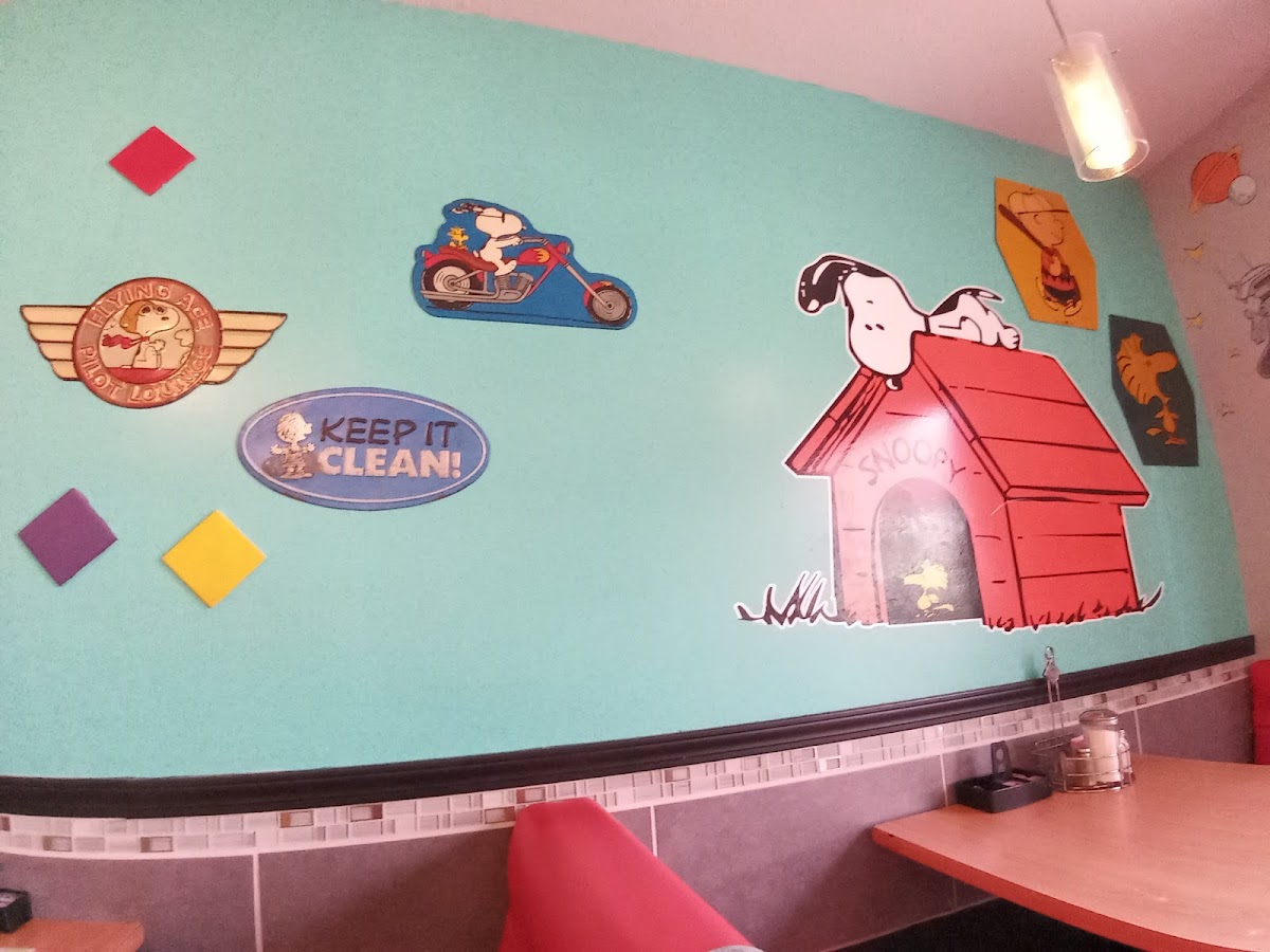 We got to be told some jokes from the waitress and that was really funny and the food was tasty and the environment was nice there was a lot of decorations around with cartoons and funny things and it was a nice homey feeling a good place to go to to sit with a friend and have a meal and a talk.