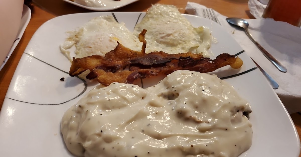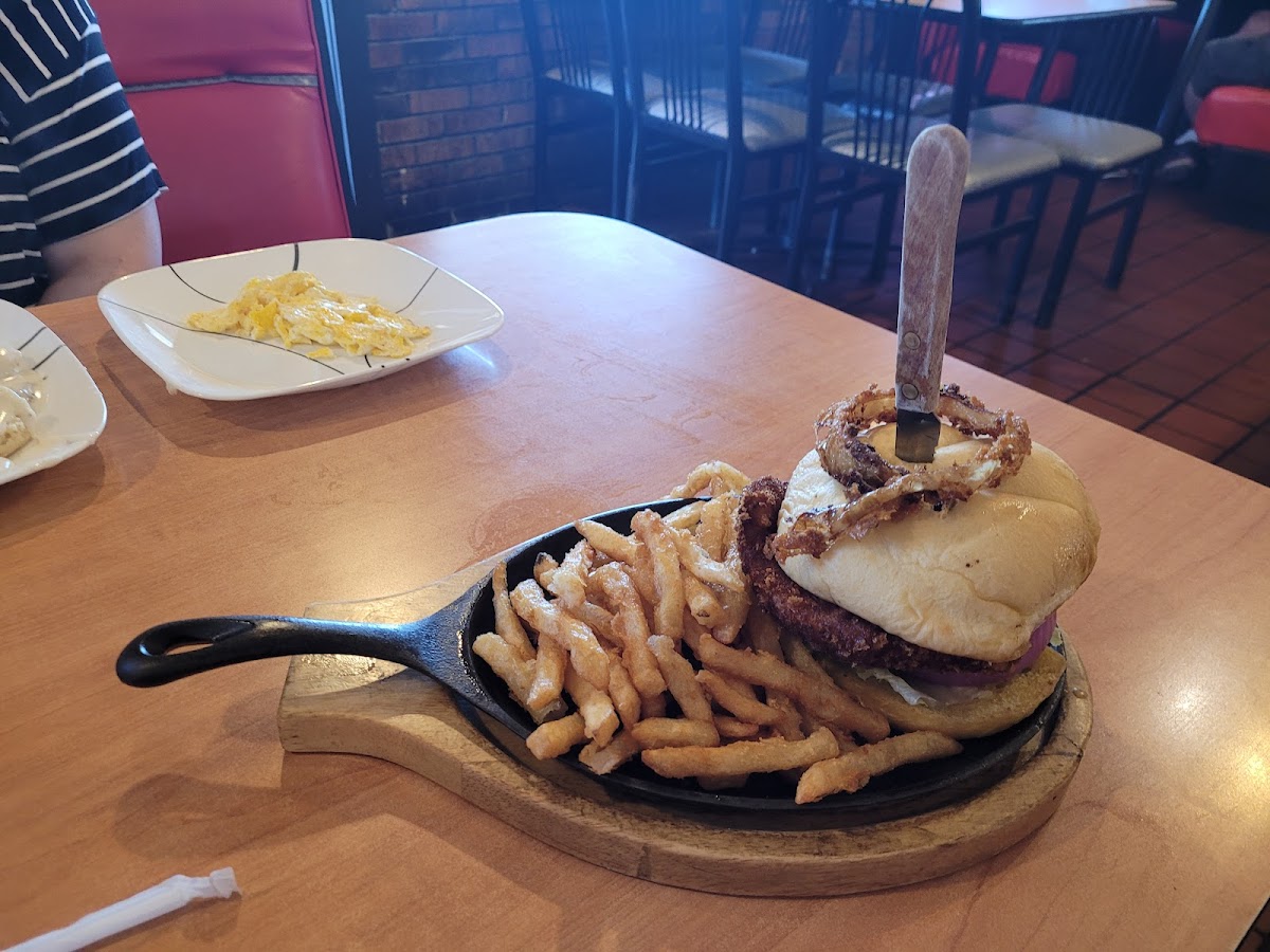 Late breakfast on a Saturday. No waiting for group of 4. Staff was very friendly. I started with a latte. I like mine plain, but you can get flavors added. The latte was generous in size and tasted very good. For food I choose the Frito chili burger with a side of fries. It's a open face burger covered in chili, cheese, red onion and Fritos. It was very good. The fries had a light coating/seasoning on them, making them very crispy. I enjoyed them as well. For the rest of the table there was a Gravy train smothered omelette, biscuits and gravy and banana nut pancakes (they were the days special). Everyone was satisfied with their choices. Definitely would eat here again. Definitely worth a try if you are in the area.